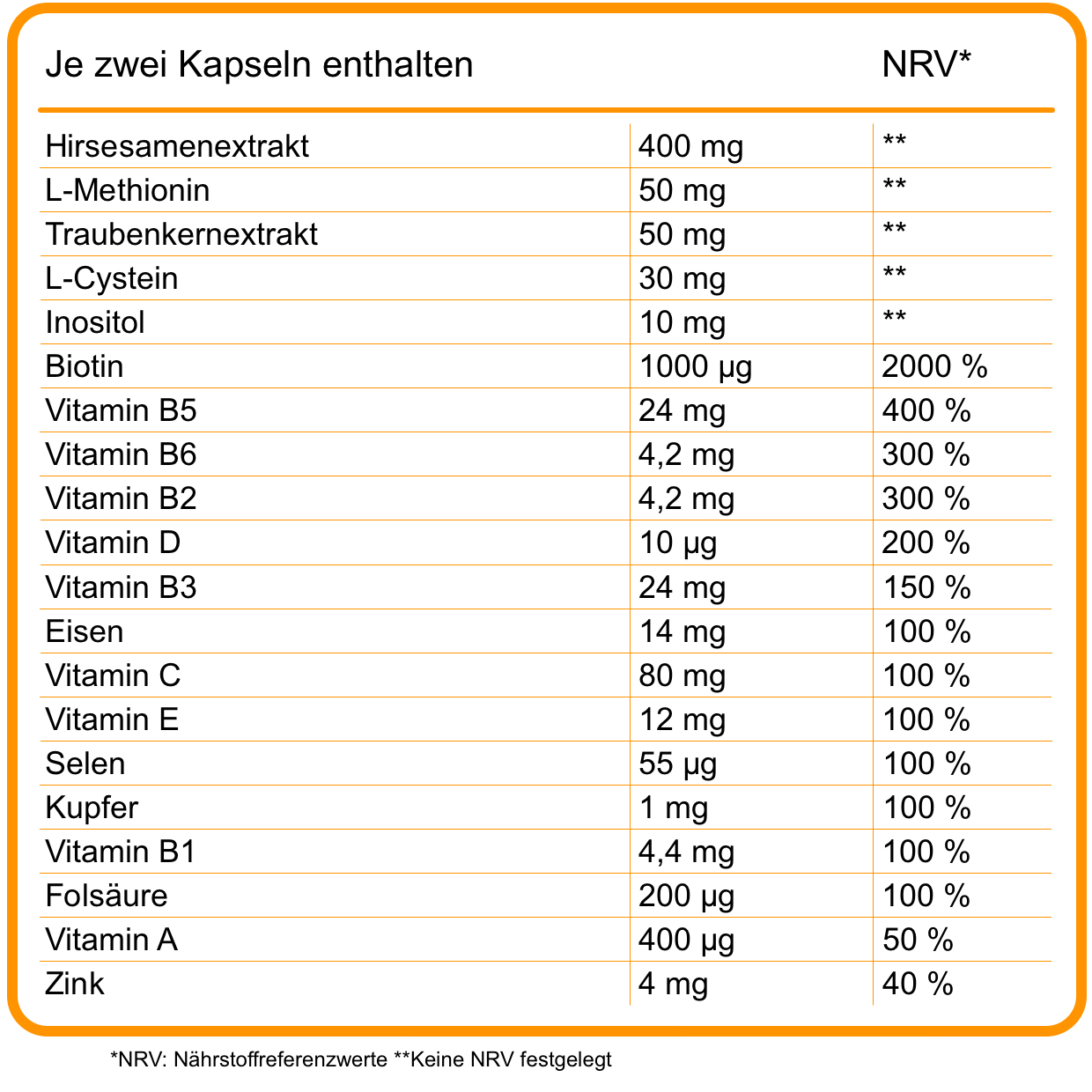 Ergänzt mit Hirsesamenextrakt (Panicum miliaceum), Traubenkernextrakt (mit OPC Anteil 40%), Folsäure, den Aminosäuren L-Methionin und L-Cystein sowie Inositol.